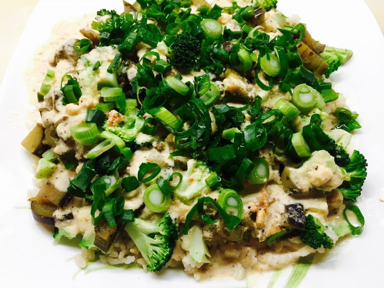 Any of the above vegetables or boiled cauliflower, a bit of rice or buckwheat, left from the breakfast yogurt and apple or pear juice.